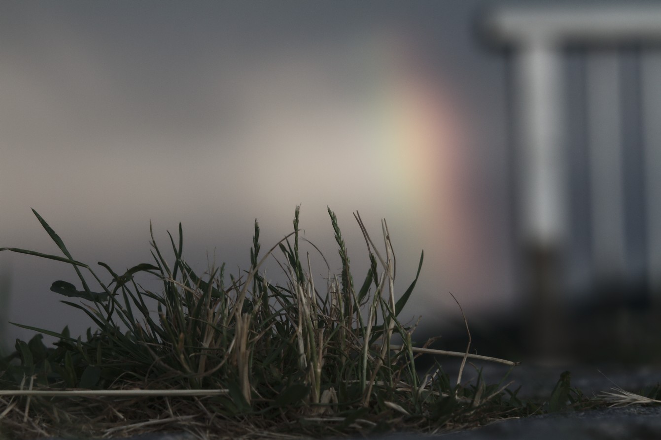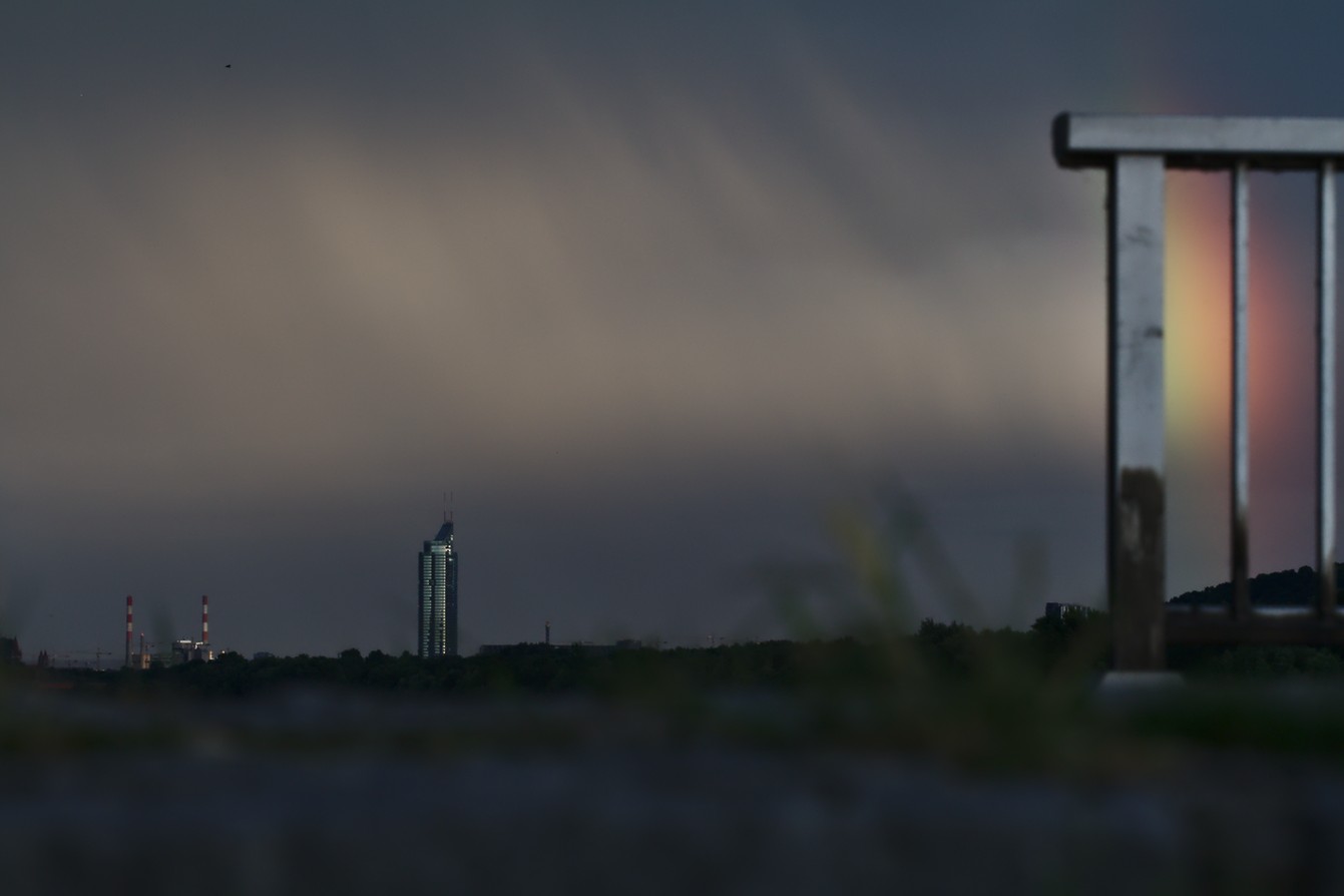 115,0 mm, f/9,0, t=1/160 sec. @ ISO 500, Aperture priority, Belichtungsmessung: Partial | Canon EOS 7D, EF70-200mm f/2.8L IS II USM | Motiv: Das Motiv ist nicht eindeutig: Ist es das fokussierte Hochaus? Oder doch die Landschaft? Oder vielleicht doch der Himmel? | Bildgestaltung: Der Betrachter ist am Boden. Buchstäblich! Von unten eine Landschaftsaufnahme zu machen ist ungewöhnlich, dementsprechend findet sich der Betrachter in einer ungewohnten Perspektive wieder. Im Vordergrund, praktisch vor seiner Nase, ist schemenhaft noch das Gras am Boden zu erahnen | Licht: | Darktable