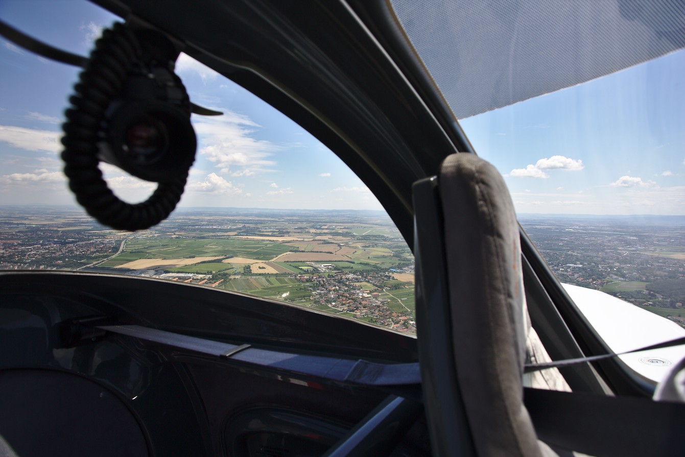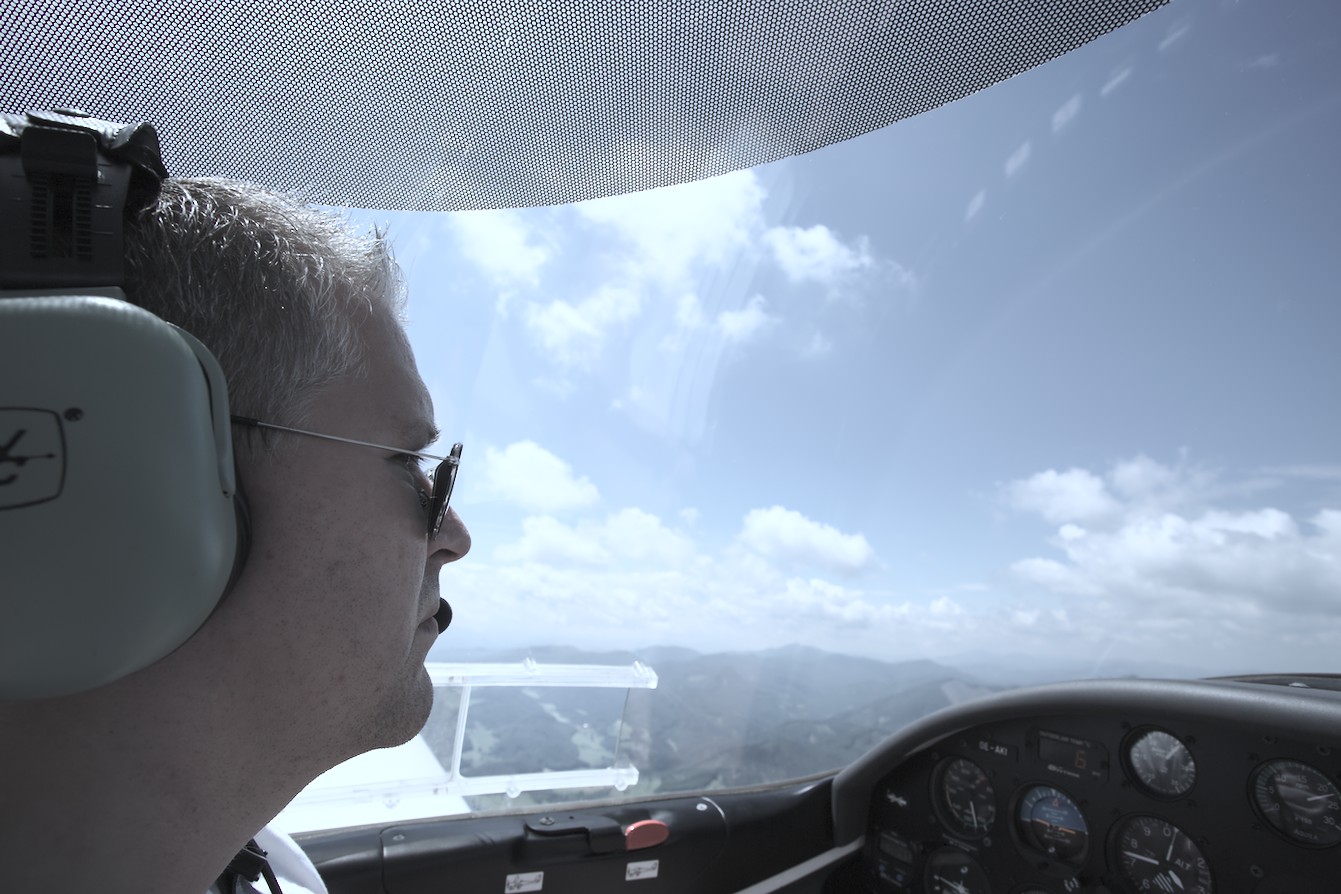 Motiv: Während des Fluges habe ich mich im Wesentlichen um stimmige Innenraumaufnahmen bemüht, ich fand es unerwartet schwer aus der Kanzel heraus interessante Aufnahmen der Umgebung zu machen. Der Blick zurück hat sich jedoch gelohnt … Das Ergebnis zeigt eigentlich zwei Motive: Augenscheinlich eine Landschaft, Genauso ist aber, etwas subtiler, auch der Innenraum des Flugzeuges. ist eine interessante Kombination einer Landschaftsaufnahme mit der Situation und Stimmung in dem Sportflugzeug. | Bildgestaltung: Eine unorthodoxe Perspektive, gleichzeitig aber die die schönste Landschaftsaufnahme des Fluges. Das Foto gibt jedoch gut die Stimmung und die Platzverhältnisse an Bord des Kleinflugzeuges wieder und ist eine interessante Kombination dieser recht unterschiedlichen Motive. Die nach vorne gerichtete, durch die Unschärfe schemenhaft wirkende Kamera im Flugzeug stellt eine fast schon ironische Antithese für dieses Foto dar. | Licht: Ausgewogen. | Darktable Spielerei mit im Wesentlichen mit Exposure, Shadows und Highlights. Der Kontrast wurde ein wenig erhöht und geschärft. |