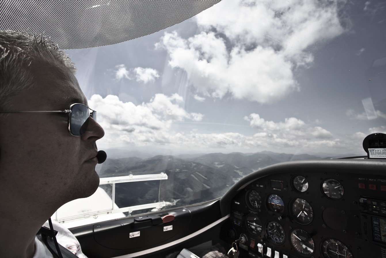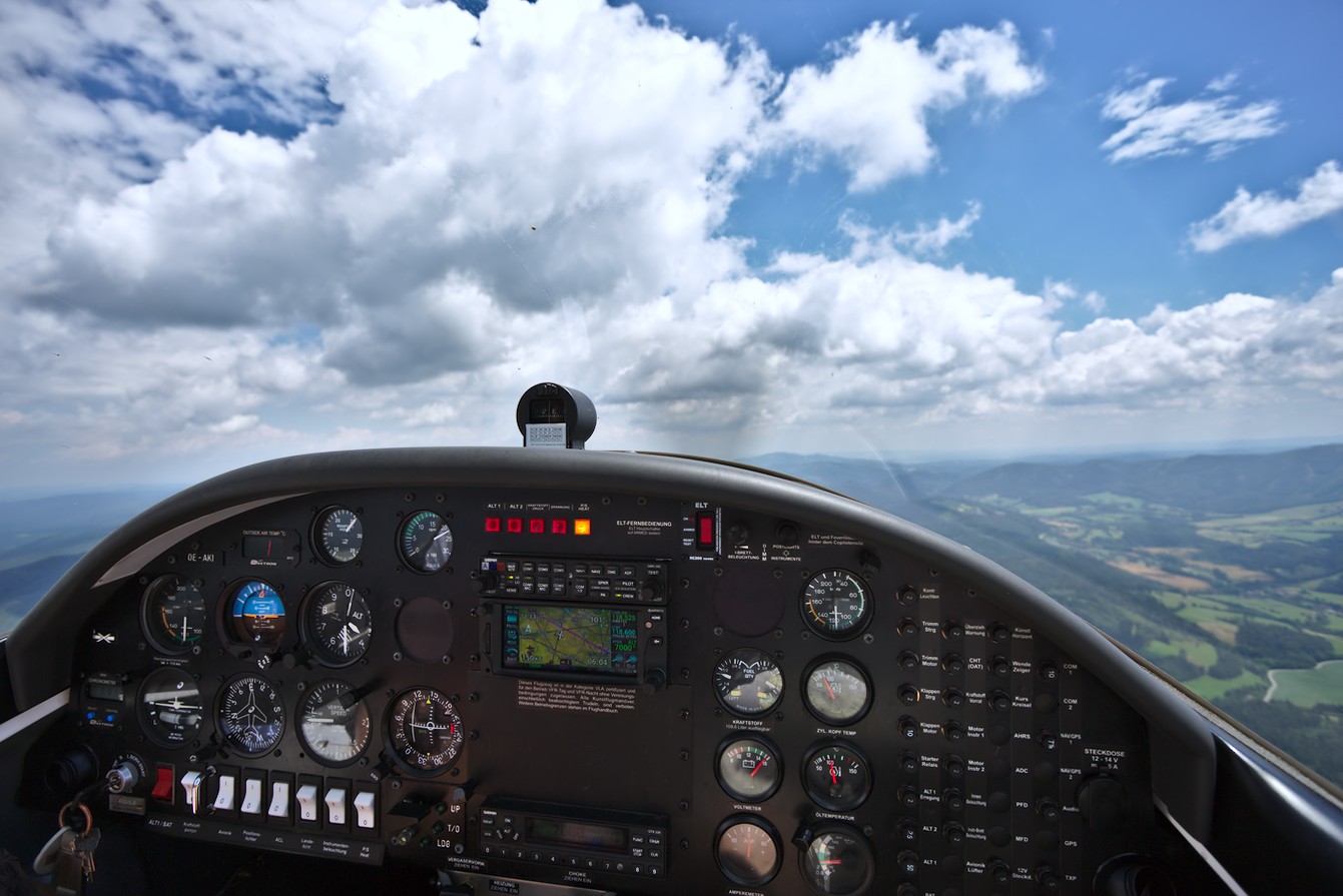 Motiv: Ein realistisches Bild aus dem Cockpit: Hier macht sich das Weitwinkel-Objektiv bezahlt. | Bildgestaltung: Instrumententafel, Himmel, Wolken, bisschen Landschaft: Klischeesammlung zum Thema “Schnappschuß aus dem Cockpit” | Licht: Dank der Wolken konnte sowohl der Himmel, als auch das Cockpit ausgewogen belichtet werden | Postprecessing: Darktable.