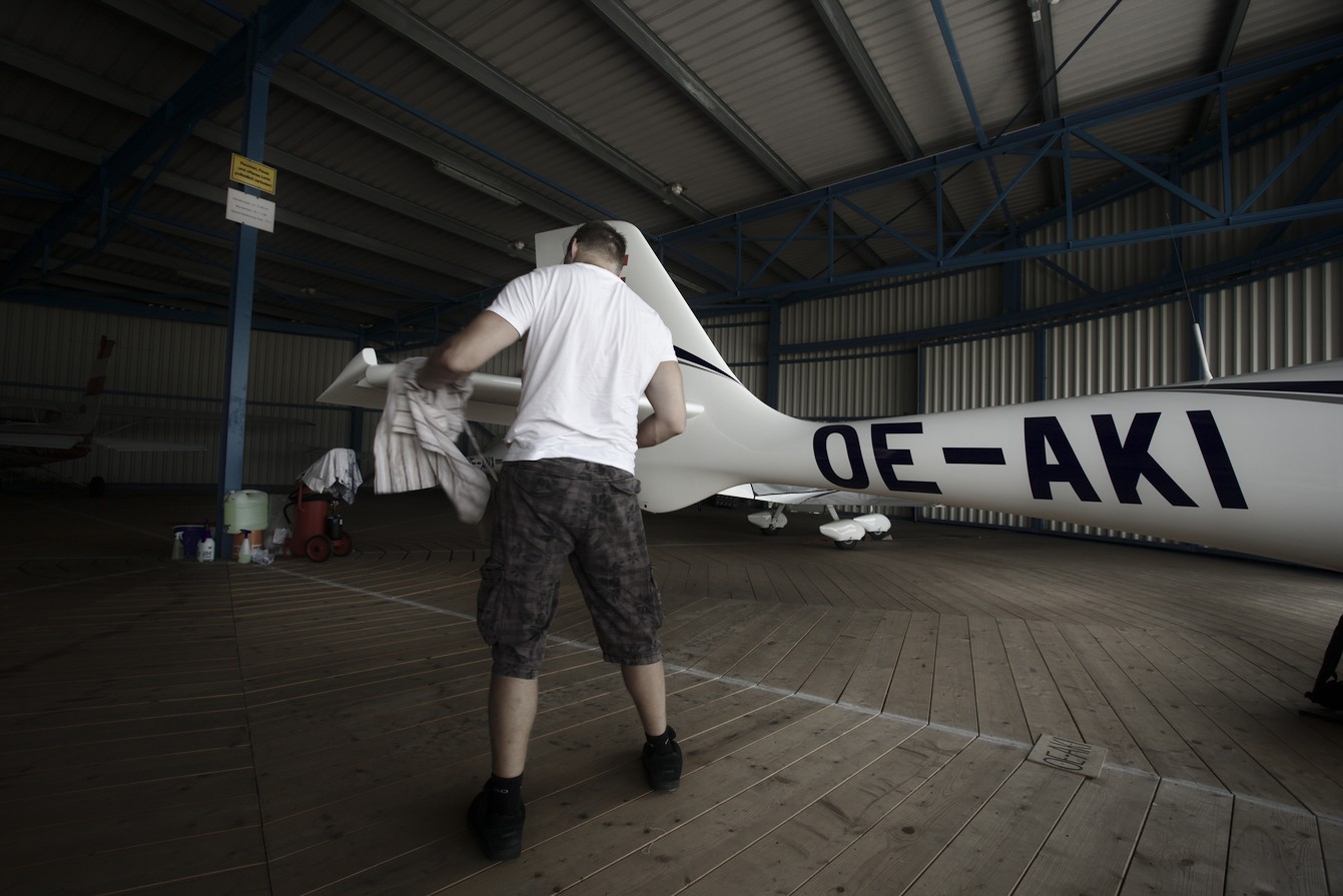 Motiv: Der Pilot und sein Flugzeug. | Bildgestaltung: Prominent die Kennung des Flugzeuges, was diesem eine Identität gibt und dem Bild eine gewisse Authentizität verleiht | Postprecessing: Darktable. Sättigung reduziert, die Schatten aufgehellt.