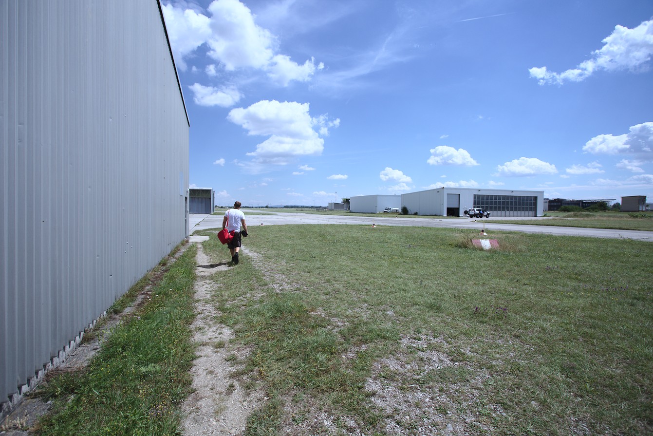 Motiv: Der Pilot einerseits, die dazu vergleichsweisen großen Anlagen auf der anderen Seite. | Bildgestaltung: Der Pilot geht am Rande des Bildes und vermittelt daher eine gewisse Bedeutungslosigkeit seiner Person im Kontext des Flugbetriebes. | Licht: Hart. | Postprecessing: Darktable.